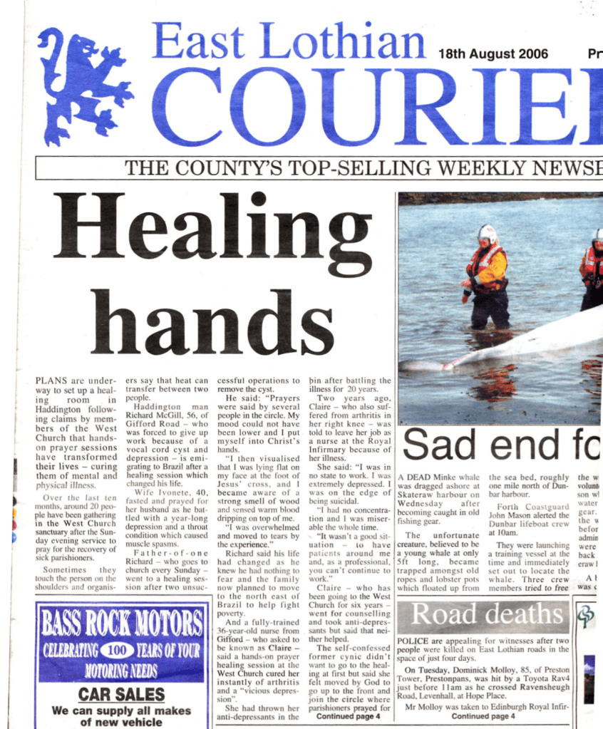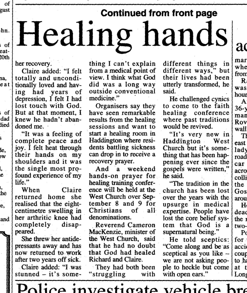 A Healing Room was opened in the West Church following these healings and the two testimonies of Claire and Richard made it into the East Lothian Courier. Further healings took place over time.